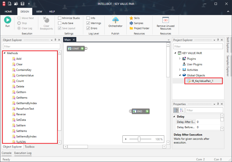 Global Objectsを展開します。Global Objectsの下にあるKeyValuePair コンポーネントをダブルクリックすると、オブジェクト エクスプローラー セクションにKeyValuePairコネクタのすべての利用可能なメソッドが表示されます。