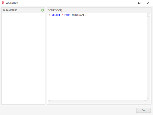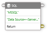 OKをクリックします。 コネクションストリングテキストボックスをダブルクリックし、選択したコネクションプロバイダに基づいてコネクションストリングを記述します。(MSSQLのコネクションストリング:Data Source =””; Initial Catalog = ""; Integrated Security = False; User Id = ""; Password = ""; MultipleActiveResultSets = True)- SQLコンポーネントのタイトルバーをダブルクリックします。SQLエディタダイアログボックスが表示されます。