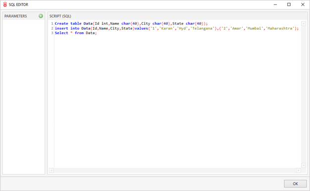 - スクリプト(SQL)では、実行するクエリを作成する必要があります。この例では、テーブルを作成し、テーブルにデータを挿入し、テーブルからデータを選択してOKをクリックするクエリを作成します。
